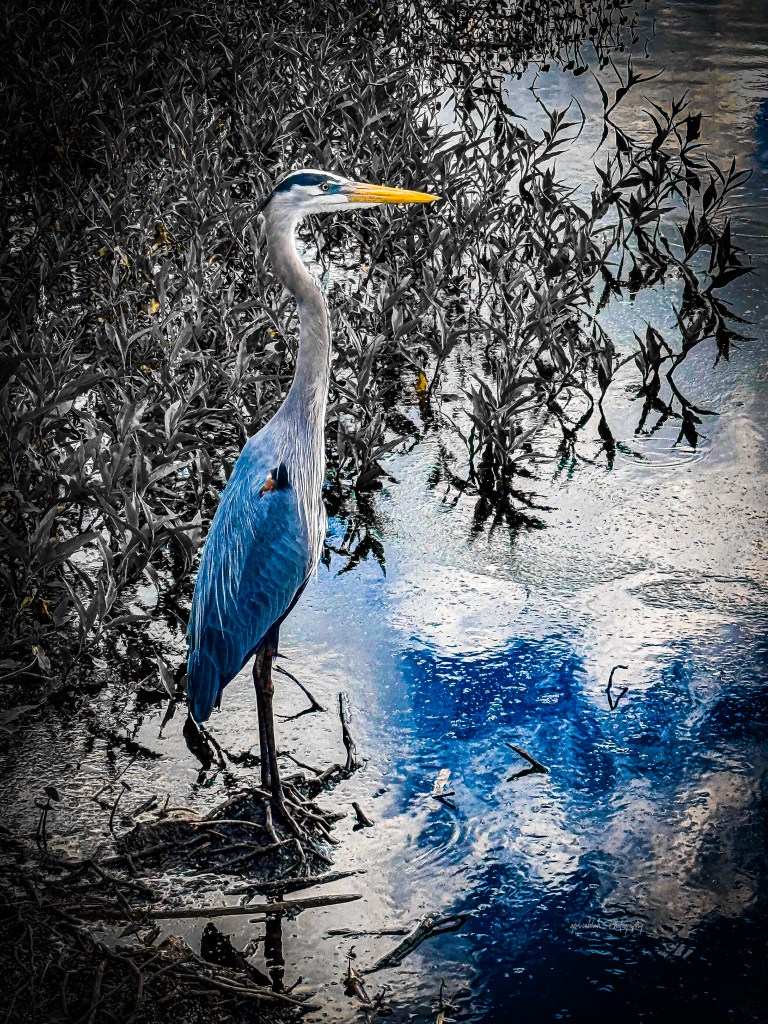 One of the things I love most about photography happens after the shutter clicks. Editing gives me the freedom to explore different ways of seeing. By muting much of the surrounding vegetation and emphasizing the blues in the heron and the reflected sky, the image shifts from a simple wildlife photograph into something a little more interpretive. Color becomes part of the story.